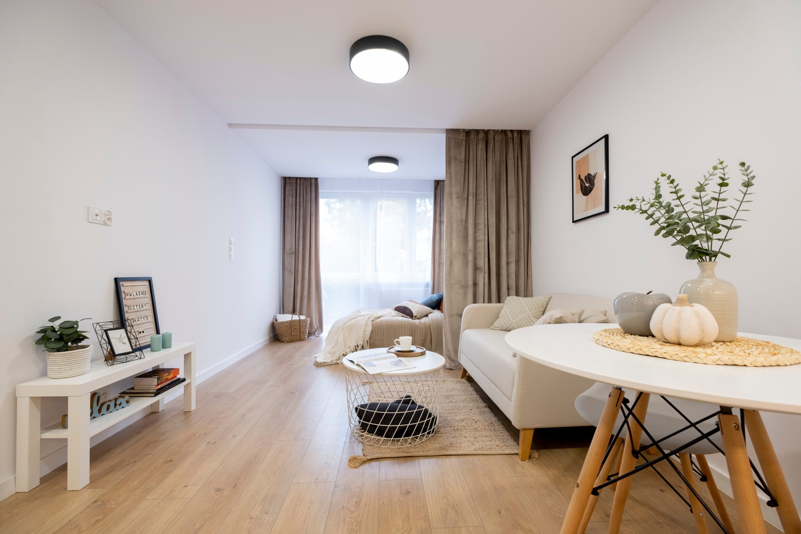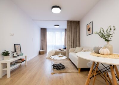 Mamy tutaj połączoną strefę dzienną z kuchnią. Dodatkowo za pomocą zasłon wydzieliliśmy sypialnię. Jest to rozwiązanie praktyczne, ponieważ nie blokuje dostępu światła i nie zacieśnia przestrzeni, a daje też poczucie intymności. Zasłony ocieplają również wnętrze i czynią je przytulnym.