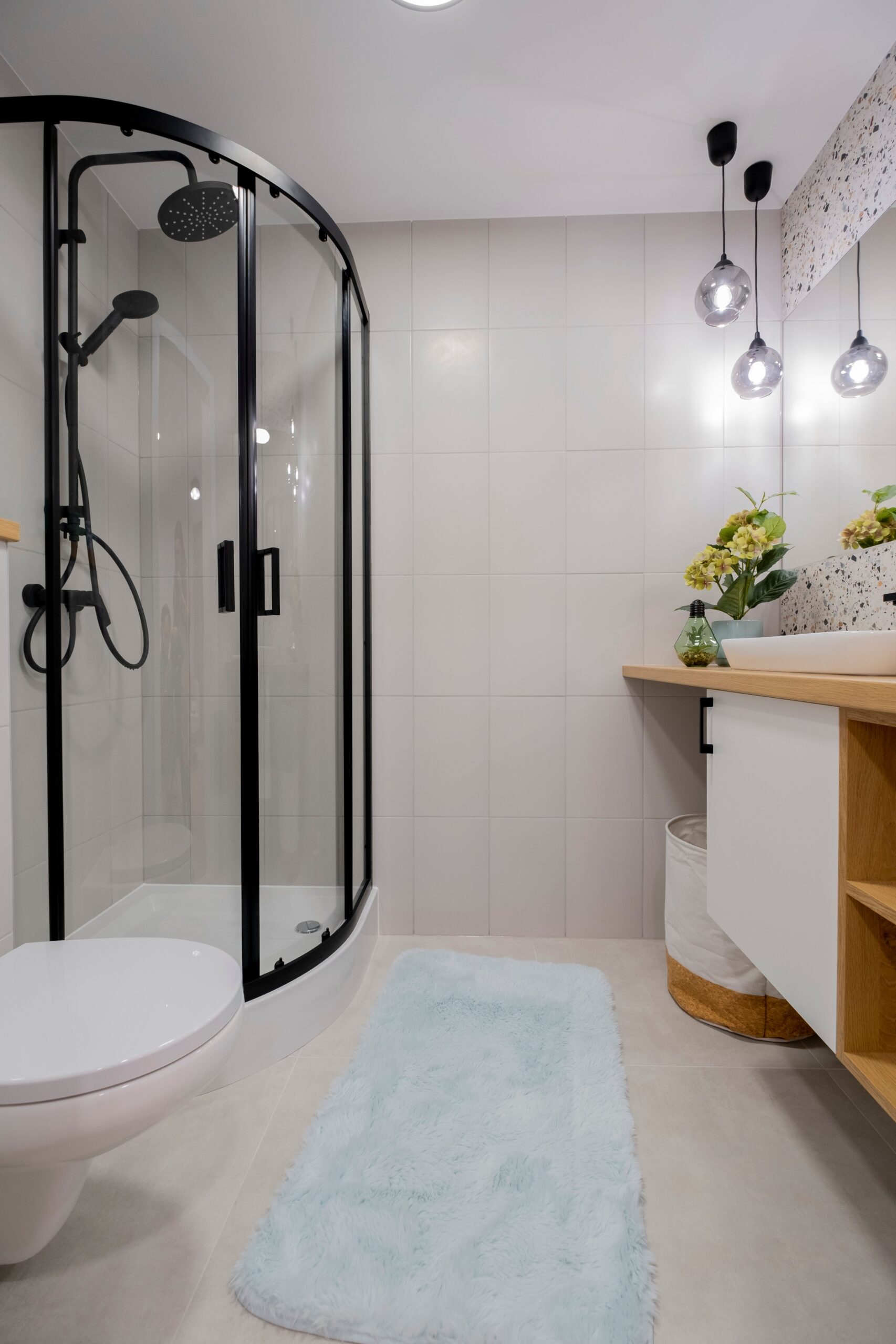 W łazience pojawił się modny motyw lastryko. Duże lustro dodatkowo powiększa optycznie przestrzeń.