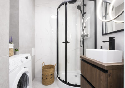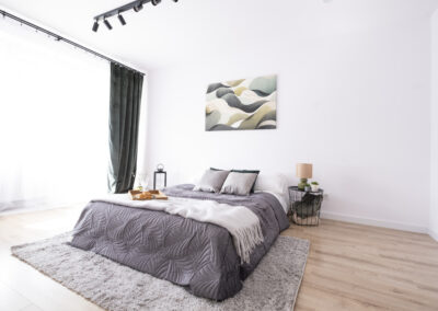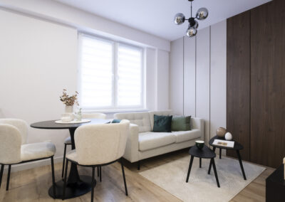 Mieszkanie zostało wyposażone w niezbędny sprzęt AGD, zabudowę kuchenną, łazienkową i szafę w przedpokoju. W salonie zaś, pojawiła się unikatowa ściana dekoracyjna. Całość mieszkania utrzymana w odcieniach beżu i brązu. Jest to zdecydowanie jedna z naszych ulubionych realizacji.