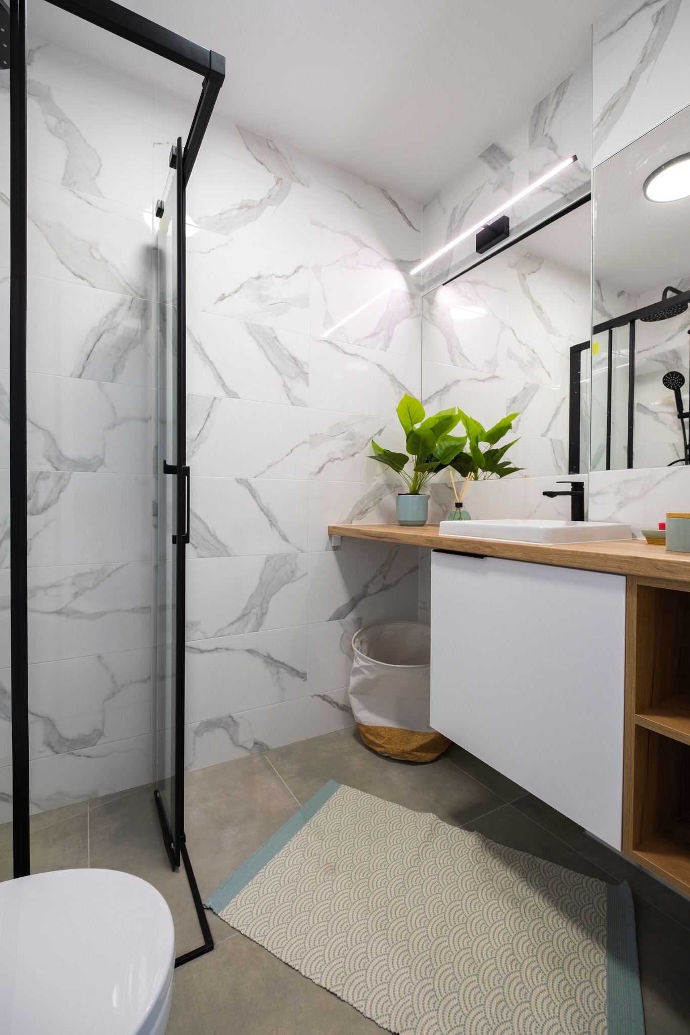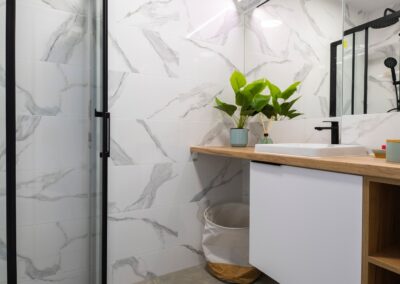 W łazience ponownie postawiliśmy na prysznic z odpływem liniowym, który jest ułatwieniem dla osób starszych i mających problem z poruszaniem się, a jednocześnie wygląda nowocześnie i estetycznie.