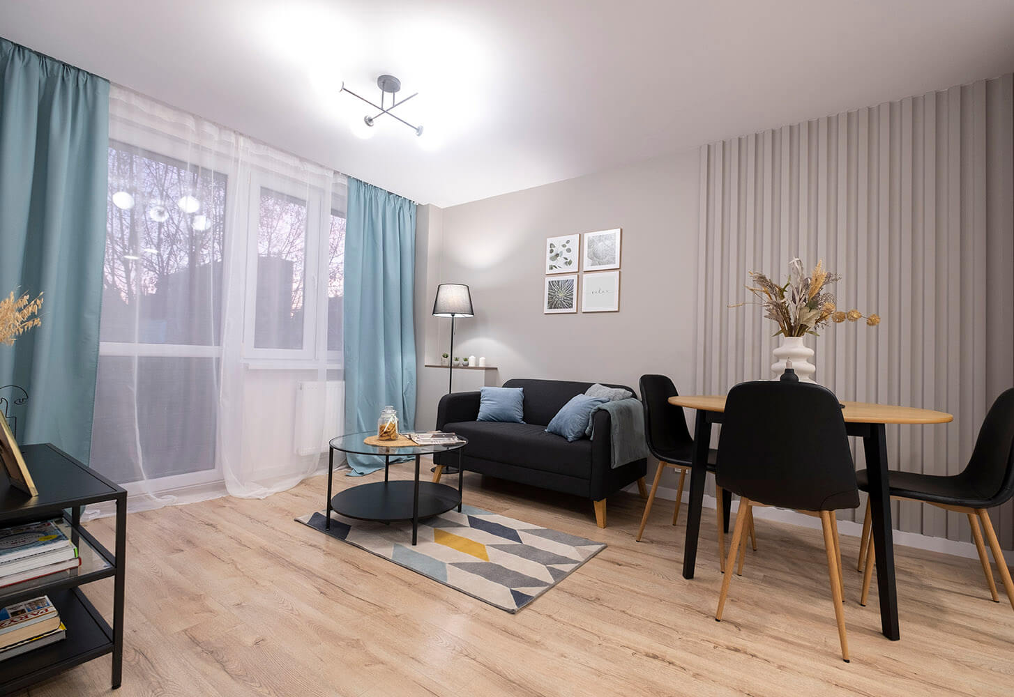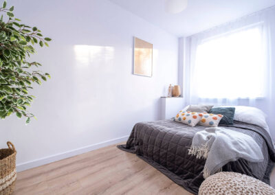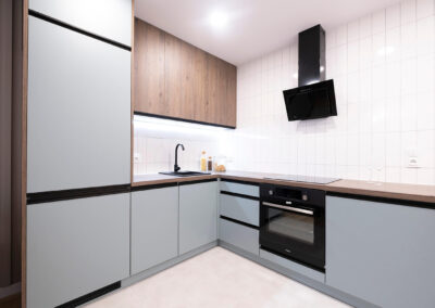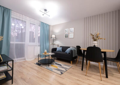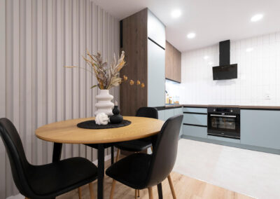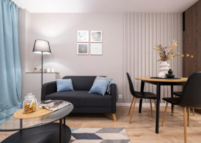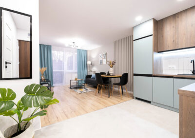 Na tej nieruchomości postawiliśmy na połączenie drewna z kolorem dusk blue. Wnętrze prezentuje się dzięki temu nad wyraz świeżo i zarazem elegancko. Dodaliśmy trochę dodatków nawiązujących kolorystycznie do kuchni i mamy kompletne, przytulne mieszkanie.