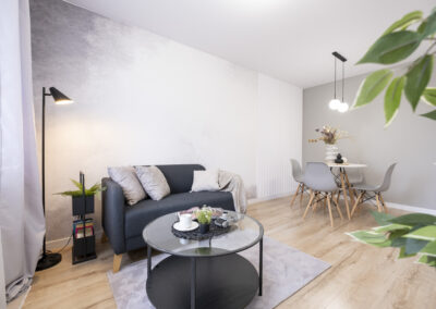 Mieszkanie zachwyca elegancją i nowoczesnym wystrojem utrzymanym w szarych barwach. To doskonała propozycja dla tych, którzy cenią sobie styl i wygodę.