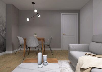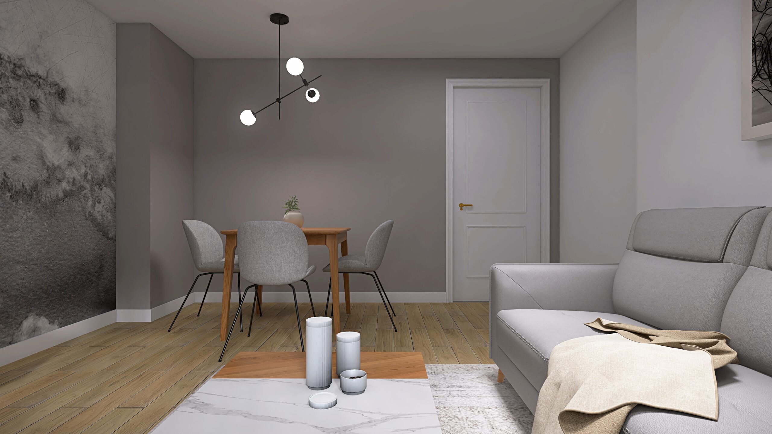 Tym razem postawiliśmy na chłodniejszą kolorystykę. Mieszkanie jest utrzymane w szarościach, ale z dodatkiem drewna, które ociepla pomieszczenia. Większy pokój zaaranżowaliśmy pod salon. Pojawi się tam tapeta z nowoczesnym wzorem.