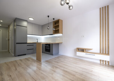 Na 45 m2 znajdziemy dwie oddzielne sypialnie, strefę dzienną z wydzieloną kuchnią oraz łazienkę.