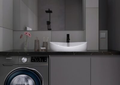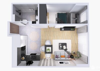 W pokoju mamy miejsce na dwuosobowe łóżko, szafę, zmieści się również biurko lub toaletka. W pełni wyposażonej łazience mamy też miejsce na pralkę.