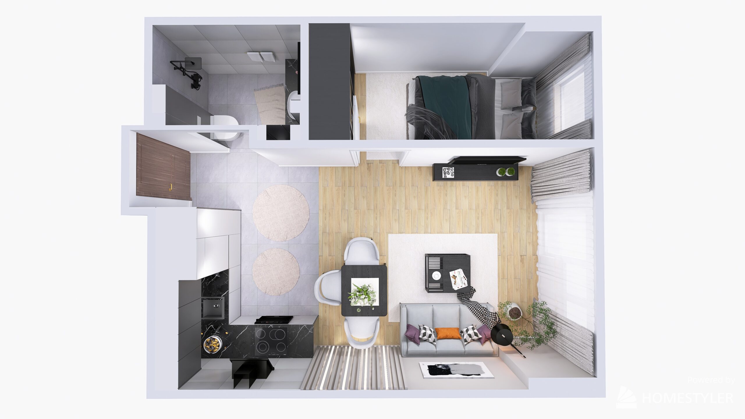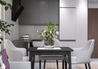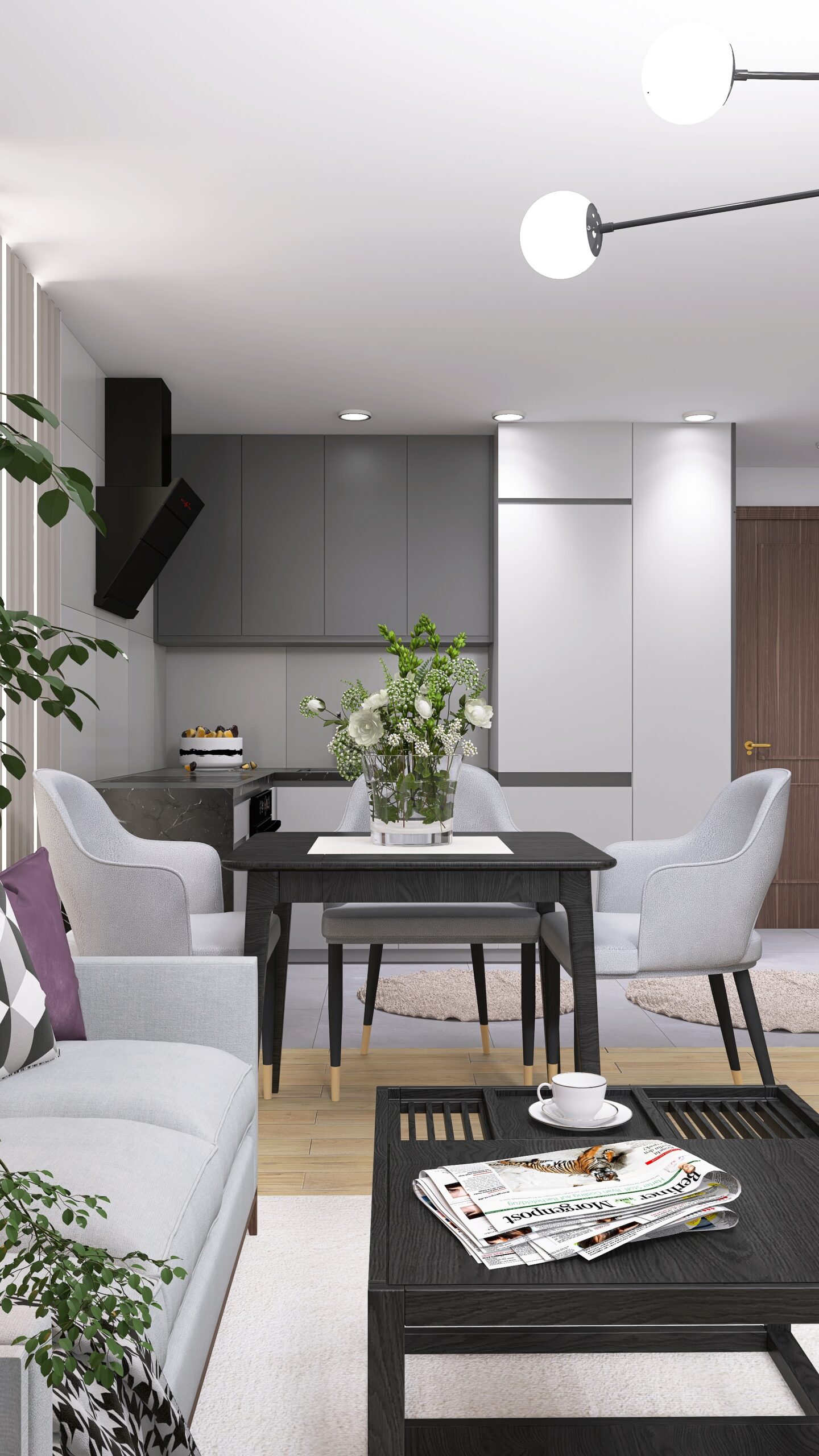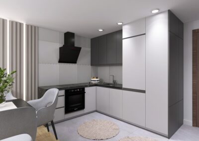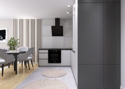 Na 33,3m2 znajdziemy salon z wydzieloną kuchnią, sypialnię oraz łazienkę. Wnętrze jest nowoczesne i eleganckie. Utrzymane w obecnych trendach. Postawiliśmy na szarości z ciemniejszymi akcentami, dodając do nich dekoracyjne światło.