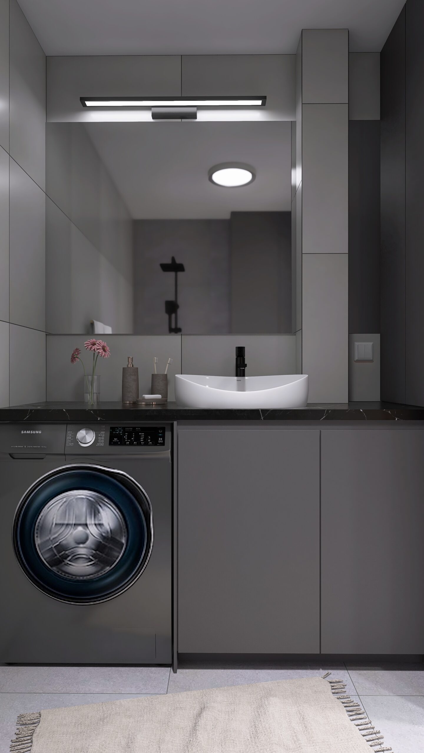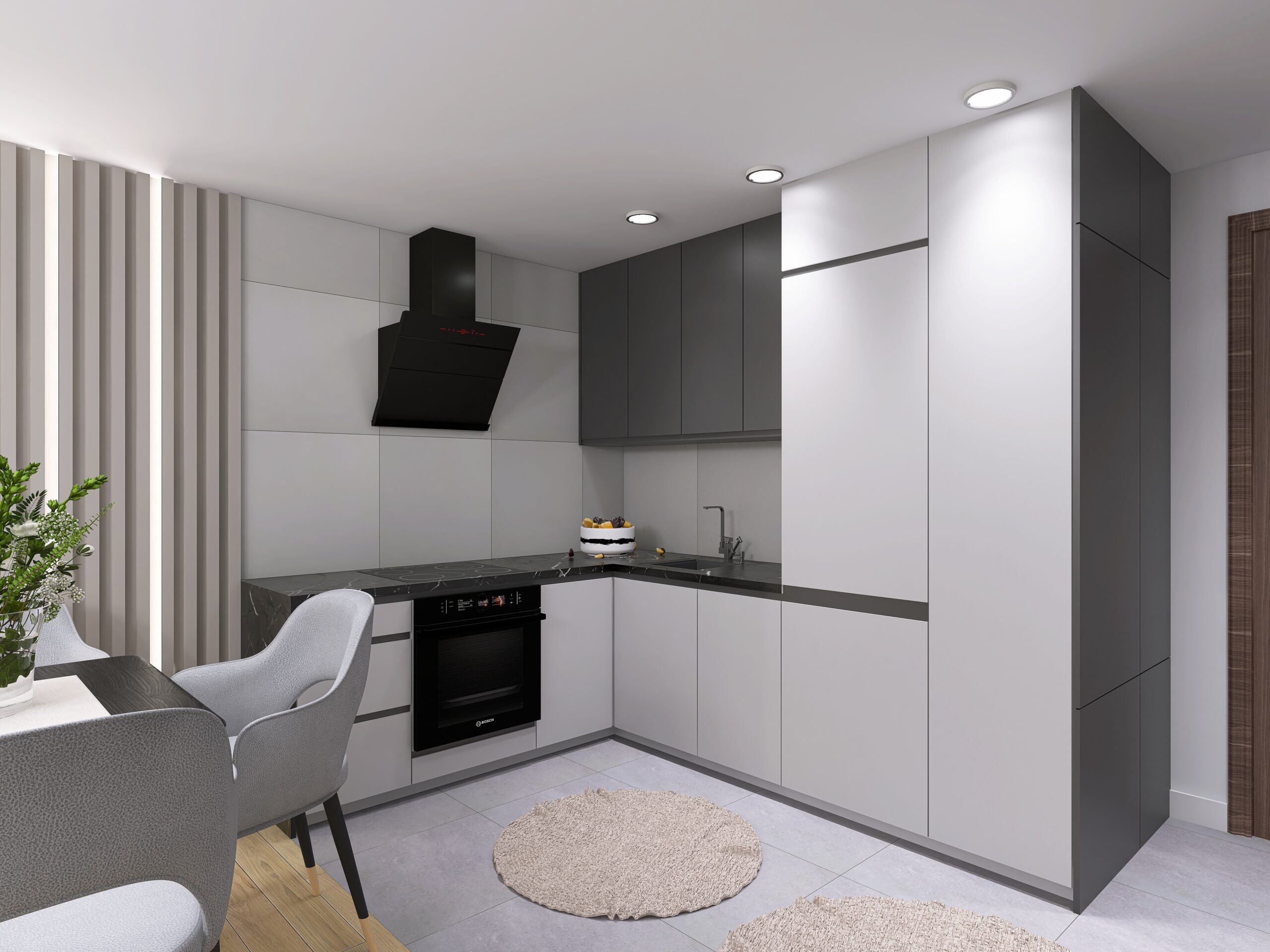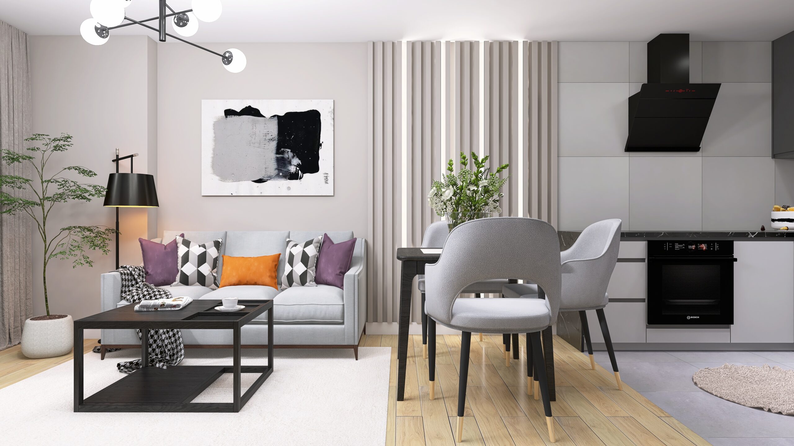 Na 33,3m2 znajdziemy salon z wydzieloną kuchnią, sypialnię oraz łazienkę. Wnętrze jest nowoczesne i eleganckie. Utrzymane w obecnych trendach. Postawiliśmy na szarości z ciemniejszymi akcentami, dodając do nich dekoracyjne światło.