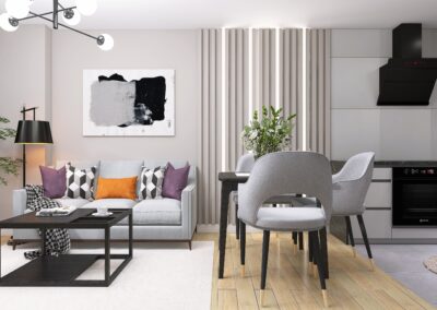 W salonie mamy kilka stref – część wypoczynkową z miejscem na kanapę, jadalnianą, gdzie zmieścimy stół z krzesłami do wygodnego spożywania posiłków oraz kuchenną z aneksem wyposażonym w nowy sprzęt agd.