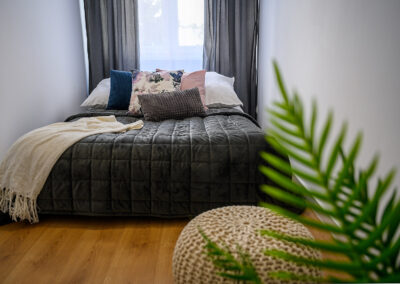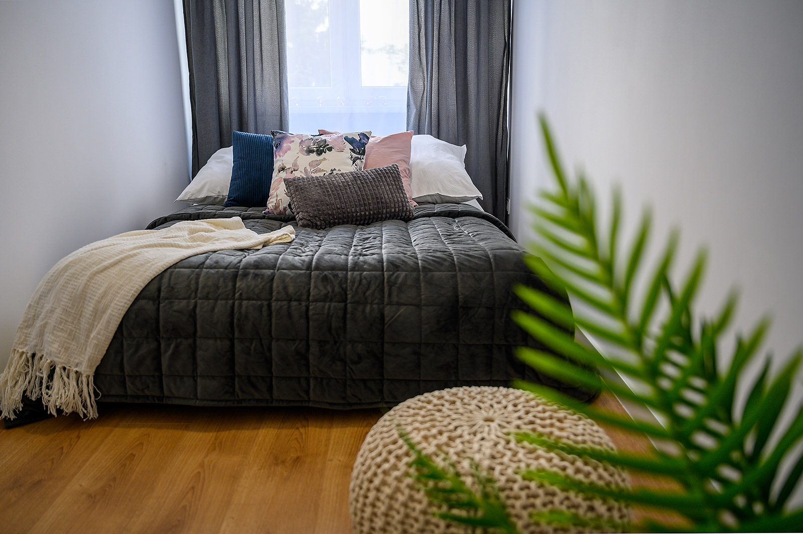 Mieszkanie przy ul. Piastowskiej 4 znajduje się na 3 piętrze z 4. Przestrzeń zaaranżowaliśmy tak, aby na 32 m2 zmieściła się strefa dzienna z wydzieloną kuchnią, łazienka, ale też osobna sypialnia.