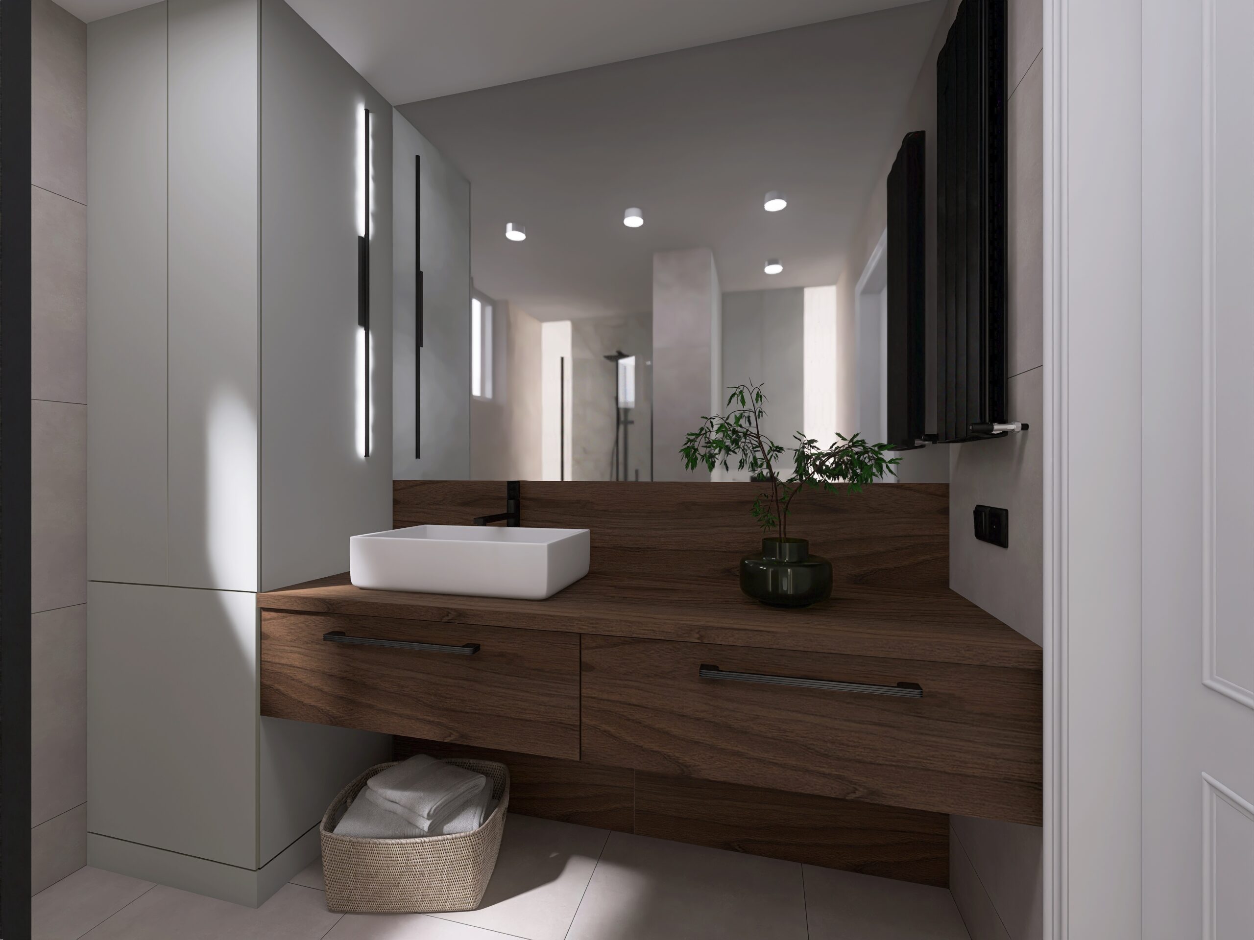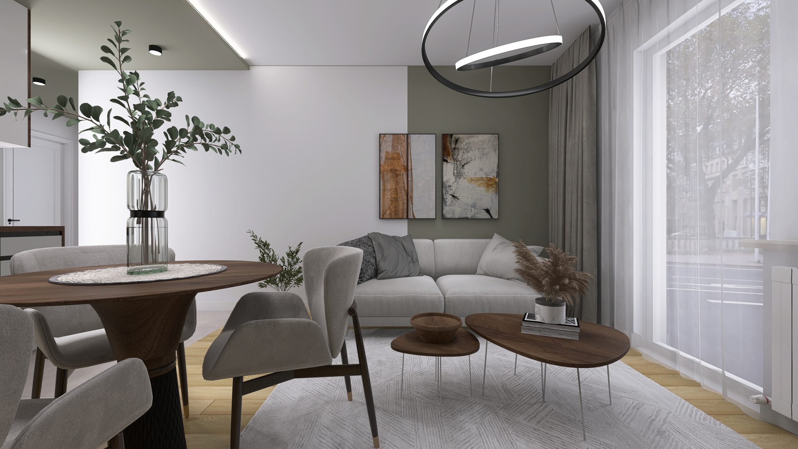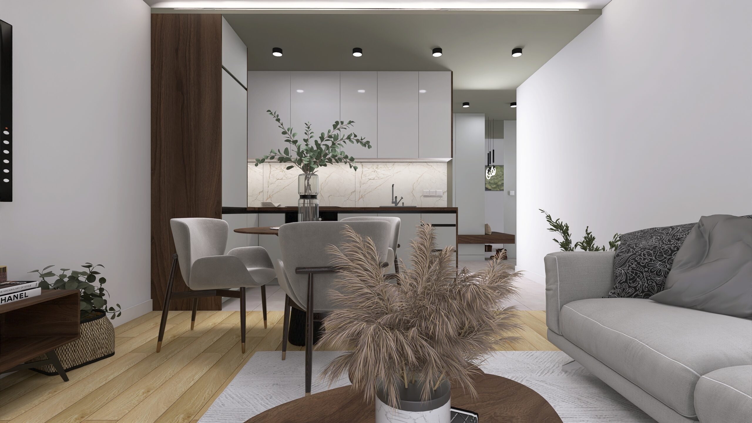Wnętrze tego mieszkania zostało zaprojektowane w stylu nowoczesnym. Całość zaaranżowana w modnej kolorystyce – odcieniach szarości i brązu. ⭐️