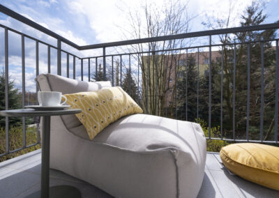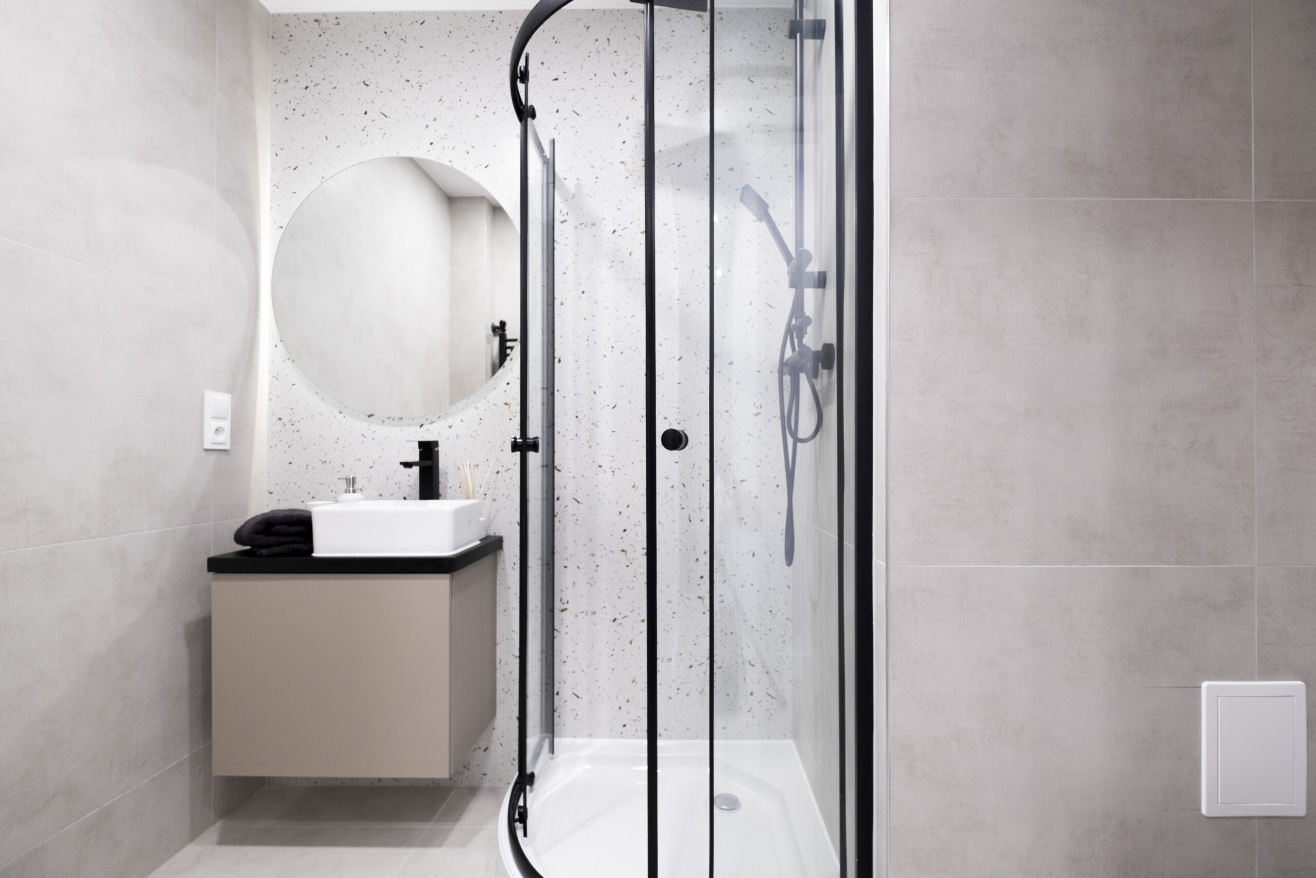 W łazience postawiliśmy na połączenie szarości z motywem tarazzo. Dodaliśmy czarną armaturę i podświetlane lustro, dzięki czemu łazienka jest nowoczesna i zapewnia wygodę i funkcjonalność. Zamontowaliśmy również pralkę, która kolorystycznie wpasowuje się w design pomieszczenia.