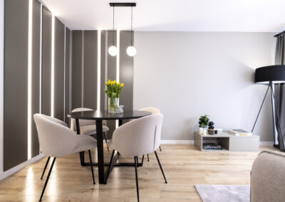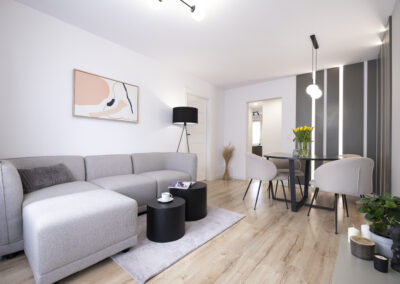 W salonie znajdziemy strefę dzienną z dużą, rodzinną kanapą, stolikami kawowym, szafką pod telewizor oraz część na jadalnię z dużym stołem z czterema krzesłami. Do tego oryginalne dodatki, jak obraz czy lampa podłogowa. Całość dopełnia dekoracyjna ściana led. Wszystkie meble w salonie mogą pozostać na wyposażeniu mieszkania.